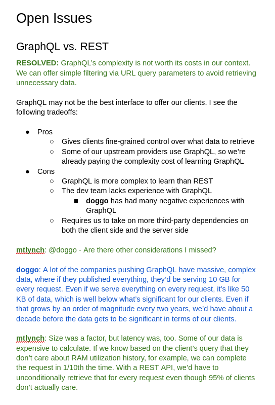 Every historical design doc I read at Google had dozens of margin threads with hundreds of comments, and it was never obvious which were still relevant.